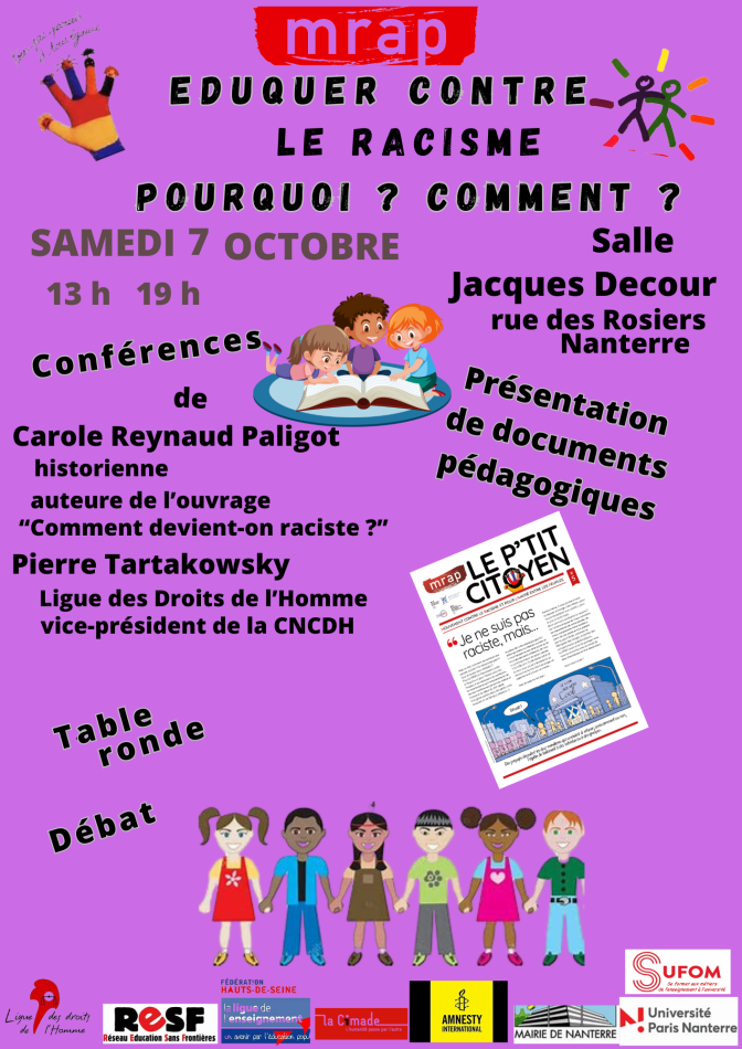 Accueil > AGENDA > 7 octobre 2023 à Nanterre : Éduquer contre le racisme. Pourquoi ? Comment ?