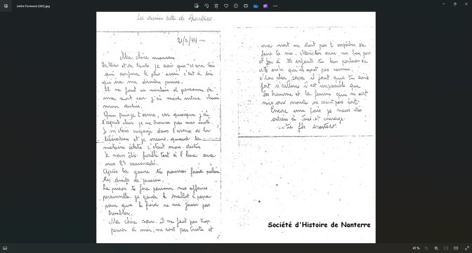 Voir également ci-dessous (ANNEXE 2) un message d’Alain Bocquet (Société d’Histoire de Nanterre) relatif au film Manouchian et ceux de l’Affiche rouge de Hugues Nancy et Denis Peschanski, qui passera sur France 2 à 21 heures le mardi 20 février, veille de la panthéonisation. Alain Bocquet a joint à son message le fac-similé de la dernière lettre de l’un des fusillés, Spartaco Fontanot.