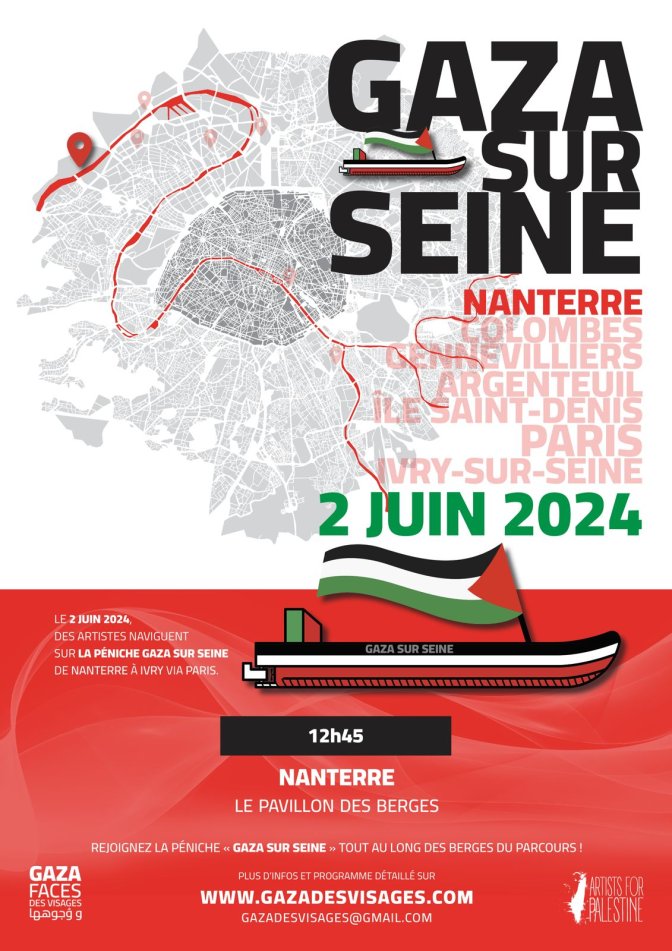 Pour le départ de la péniche depuis le chemin de l’île à Nanterre, il y aura un rassemblement à partir de 12h30 jusqu’à 14h45 avec de la lecture de témoignages, de poésie, de la musique, de la danse , des animations et un hommage particulier aux enfants tués à Gaza,